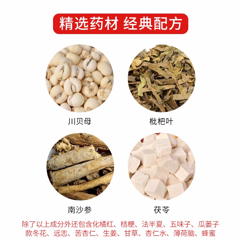 | 主要原料 | 川贝母、枇杷叶、南沙参、茯苓、化橘红、桔梗、法半夏、五味子、瓜蒌子、款冬花、远志、苦杏仁、生姜、甘草、杏仁水、薄荷脑。辅料:蜂蜜、麦芽糖、糖浆。 |