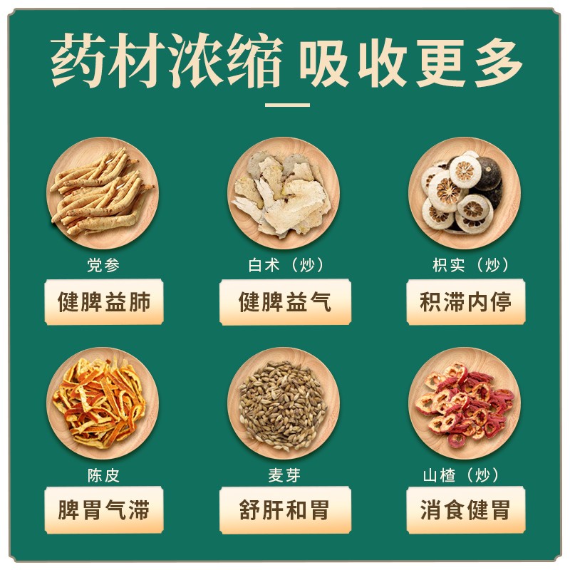 【主要成份】 党参、白术(炒)、枳实(炒)、陈皮、麦芽(炒)、山楂(炒)。