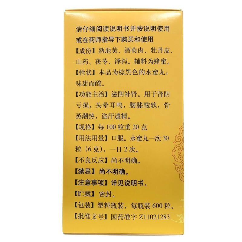 【主要成份】 熟地黄、酒黄肉、牡丹皮、山药、茯苓、泽泻。辅料为蜂蜜。